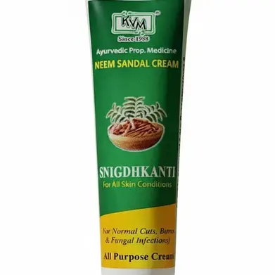 KVM Snigdhakanti is a clinically tested, premium Ayurvedic formulation designed to address a wide range of skin concerns with proven efficacy. Handcrafted using pure neem oil, sandalwood oil, olive, mango-ginger, amla, and other potent botanical extracts, this multi-benefit cream offers gentle yet powerful action, making it safe even for children’s delicate skin.